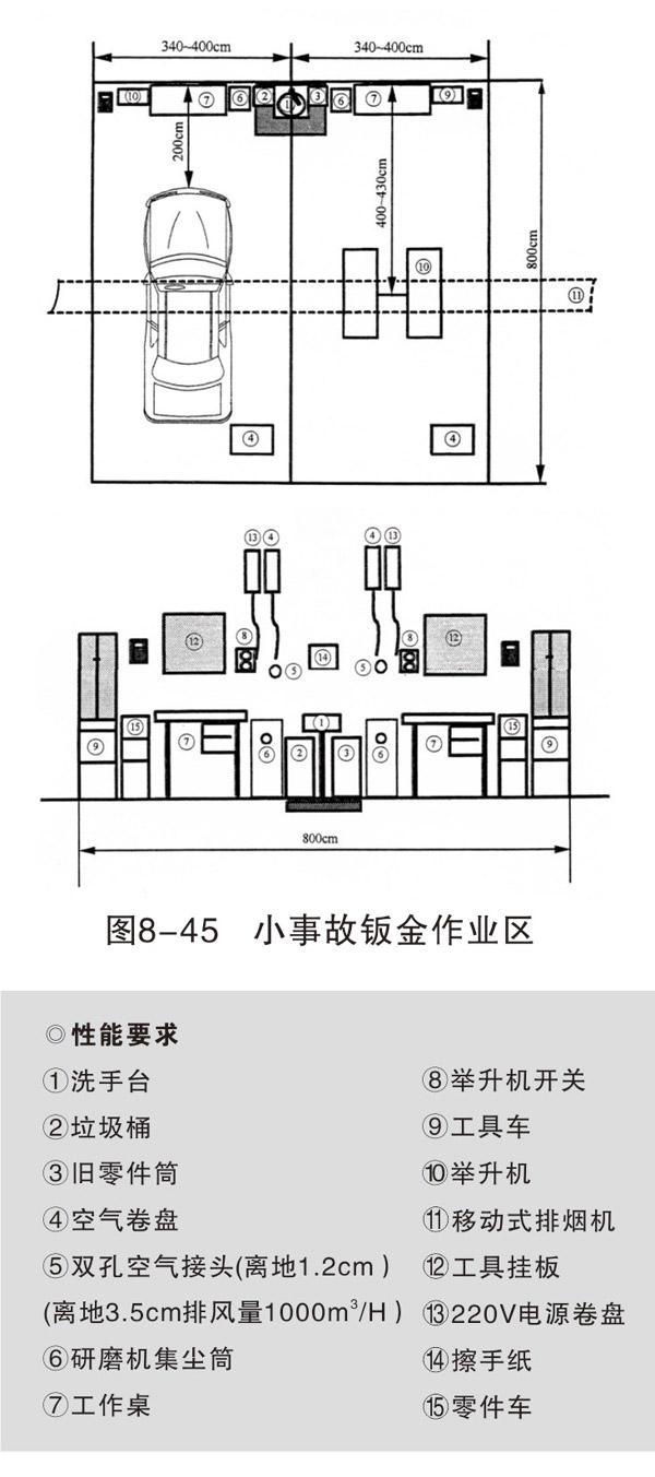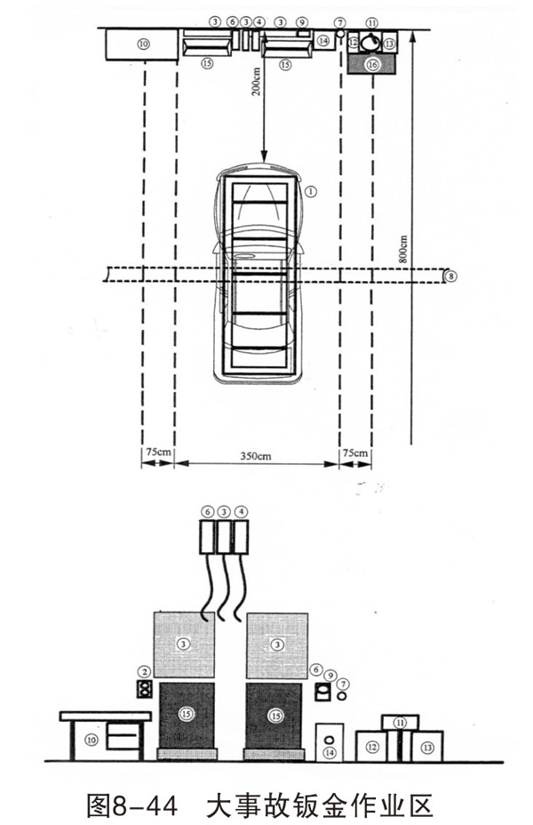 損傷修復和焊接作業區域可各設置 4~6個工位,每個工位的面積約400cm×800cm,每個工位配相應的設備和操作臺(架)。車身校正作業一般設一個工位,面積500cm×800cm。如條件允許,可以根據不同類型的校正架,設置2~3個工位。