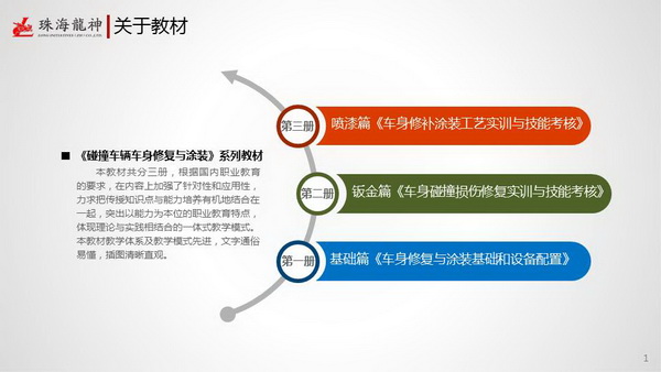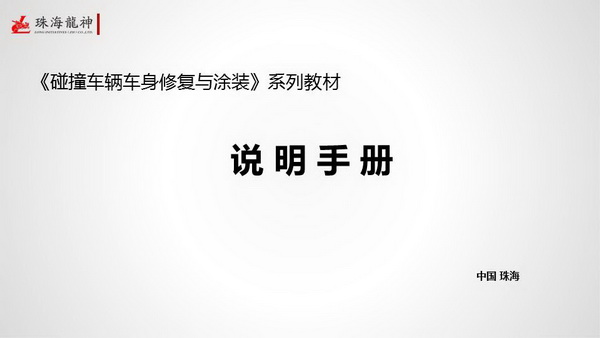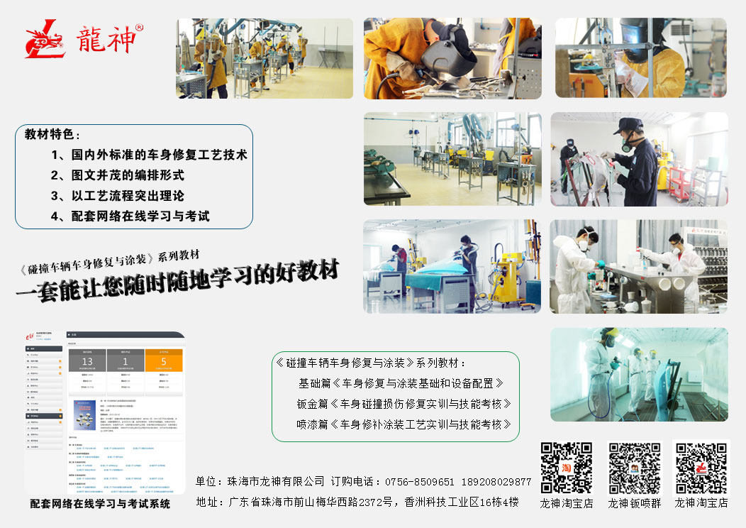 珠海市龍神有限公司2014年隆重巨獻《碰撞車輛車身修復(fù)與涂裝》系列教材:基礎(chǔ)篇《車身修復(fù)與涂裝基礎(chǔ)和設(shè)備配置》、鈑金篇《車身碰撞損傷修復(fù)實訓(xùn)與技能考核》、噴漆篇《車身修補涂裝工藝實訓(xùn)與技能考核》。