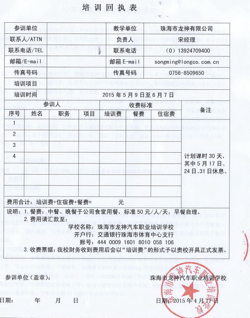 培訓時間30天,即從2015年5月9日起至6月7日止,其中5月17日、24日31日休息;期間餐費按照上課時間27天預收,實際參照離開時間調整。具體收費情況請來電咨詢。